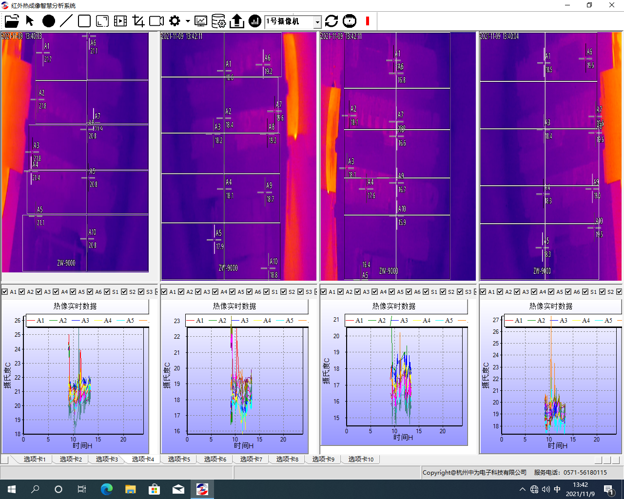 發(fā)電機(jī)碳刷在線(xiàn)監(jiān)測(cè)系統(tǒng)軟件預(yù)先使用多邊形區(qū)域測(cè)溫工具將重點(diǎn)部位框選出來(lái),區(qū)域內(nèi)最高點(diǎn)溫?cái)?shù)值及位置實(shí)時(shí)顯示,以實(shí)現(xiàn)重點(diǎn)部位重點(diǎn)監(jiān)控的目的。系統(tǒng)軟件所配置的點(diǎn)、線(xiàn)、多邊形測(cè)溫工具所框選的測(cè)溫區(qū)域都是相互獨(dú)立的,任意區(qū)域內(nèi)溫度、溫升達(dá)到其區(qū)域設(shè)置的閾值都能觸發(fā)高溫報(bào)警。