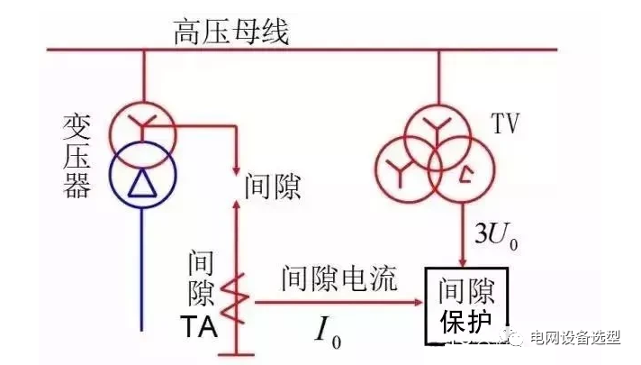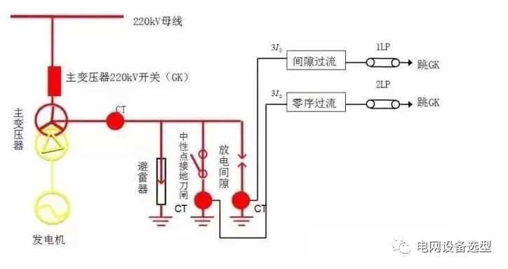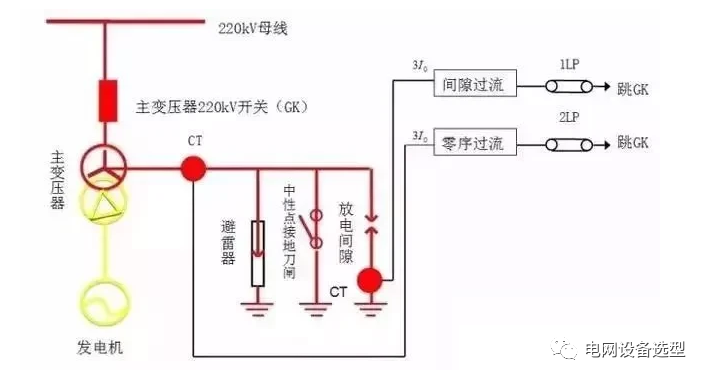 如下圖所示,為了避免由于過電壓從而將變壓器中性點絕緣性能損壞,所以,對于主變壓器中性點當下最常采用的是裝設放電間隙的方法。此外,還在放電間隙回路裝設獨立的電流互感器,如此一來就組成了一個變壓器中性點放電間隙零序過電流保護。