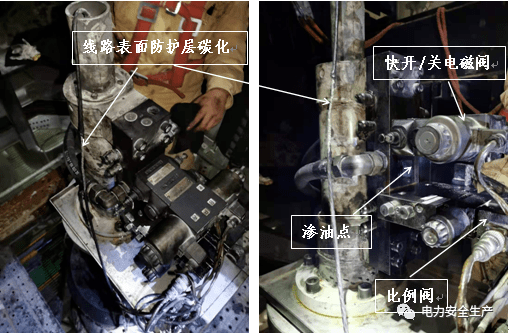 2號機組高旁閥控制機構(gòu)快開/關(guān)電磁閥結(jié)合面滲油,附近有油煙,位移傳感器線路受油煙熏烤,線路表面防護層碳化,位移傳感器信號變壞點。