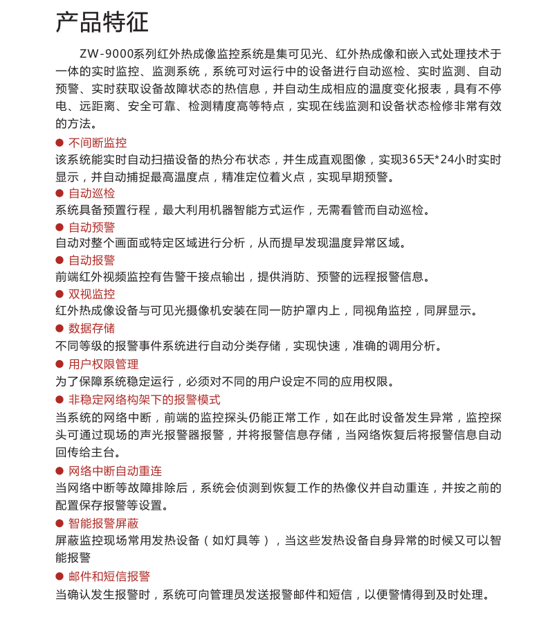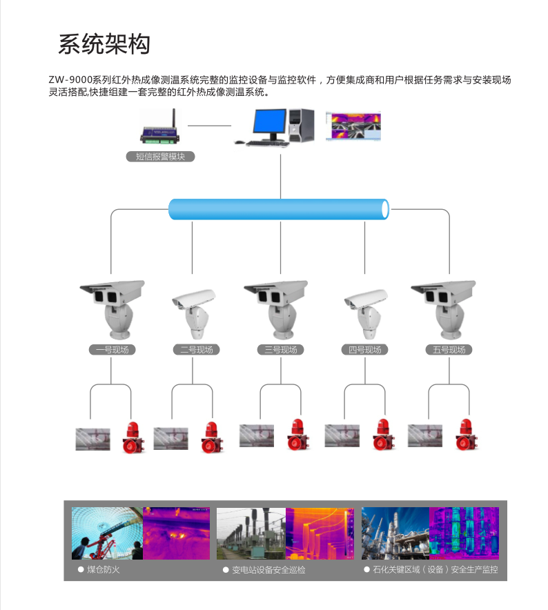 高精度多角度的紅外熱成像畫(huà)面判斷碳刷系統(tǒng)的運(yùn)行狀況及周邊風(fēng)溫,并實(shí)現(xiàn)報(bào)警功能;使用超大規(guī)模組網(wǎng)技術(shù),將電廠所有紅外探測(cè)器并網(wǎng)到一個(gè)系統(tǒng)內(nèi);超前預(yù)警,對(duì)可能發(fā)生的故障信息做出超前預(yù)警;前置紅外探測(cè)器能脫離后臺(tái)獨(dú)立工作報(bào)警;內(nèi)置溫度閥值與溫升速率雙重智能報(bào)警分析算法;可預(yù)置工作狀態(tài),生成歷史溫度曲線,將工作狀態(tài)與溫度曲線重疊分析,得到不同工作狀態(tài)下的溫度特性;定時(shí)定點(diǎn)對(duì)設(shè)備的工作狀態(tài)做出診斷,并生成診斷報(bào)告;構(gòu)建數(shù)字化、標(biāo)準(zhǔn)化、智能化的熱成像大數(shù)據(jù)平臺(tái),提供檢測(cè)任務(wù)數(shù)據(jù)統(tǒng)計(jì)、工作報(bào)表展示、數(shù)據(jù)查詢、圖像分析、歷史趨勢(shì)分析等豐富的數(shù)據(jù)管理;熱成像技術(shù)智能化與互聯(lián)網(wǎng)化的深度融合,實(shí)現(xiàn)本地?cái)?shù)據(jù)與云端數(shù)據(jù)的同步與共享,打破空間壁壘,實(shí)現(xiàn)巡檢任務(wù)跨地域管理;預(yù)置工作狀態(tài),生成歷史溫度曲線,將工作狀態(tài)與溫度曲線重疊分析,得到不同工作狀態(tài)下的溫度特性。